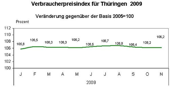 Autor: nnz/knDer Verbraucherpreisindex für Thüringen weist im November genau wie im Oktober 2009 einen Indexstand von 106,2 Prozent aus. Die Jahresteuerung liegt nach Mitteilung des Thüringer Landesamtes für Statistik erstmals seit sechs Monaten mit 0,1 Prozent leicht über dem Vorjahresniveau.