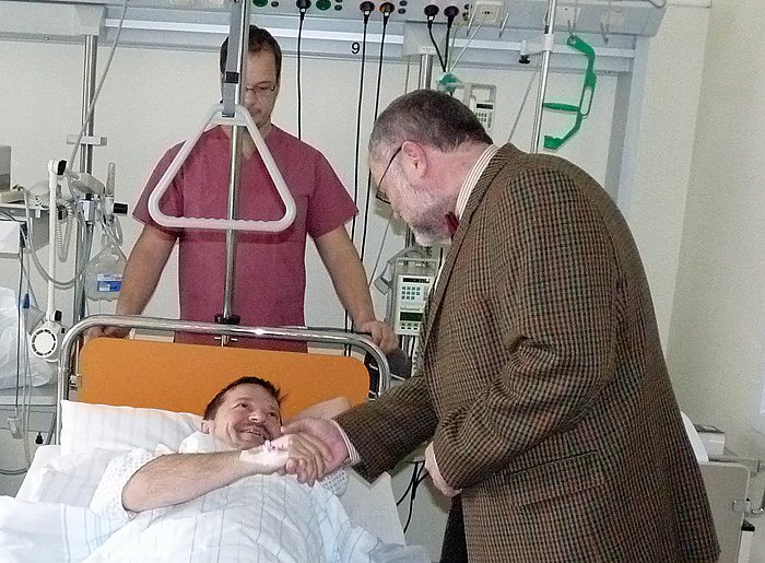 Beim Rundgang traf der Landrat auch ein recht bekanntes Gesicht. Possenwirt Bernd Jahn musste kurzzeitig ins Krankenhaus einrücken. Tröstenden Worte gab es natürlich gleich vom Landrat persönlich. Aber auch der MR Dr. Hans Kästner (Ärztlicher Direktor des DRK-Krankenhauses Sondershausen), der Peter Hengstermann und Karl-Heinz Genzel beim Rundgang begleitete, spendete so manchem Patienten Trost.