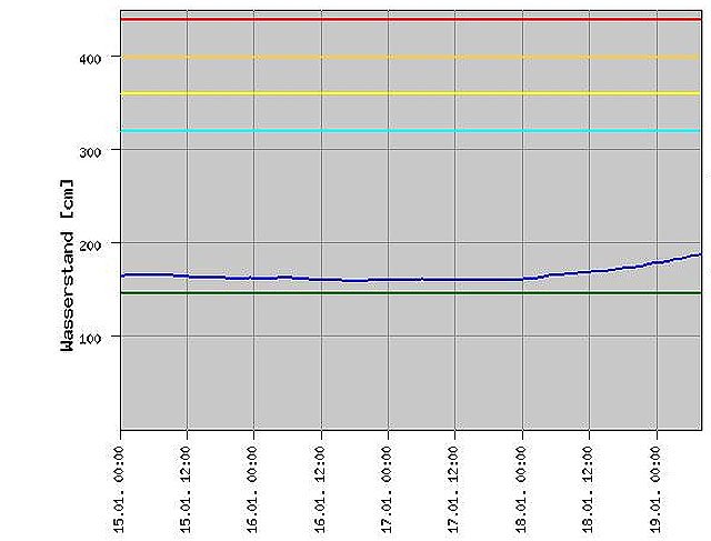- Meldebeginn : Vorwarnstufe für ein sich anbahnendes Hochwasser - blaue Linie