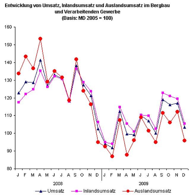 Die 878 Betriebe mit 50 und mehr Beschäftigten im Bergbau und Verarbeitenden Gewerbe erzielten im Dezember 2009 einen Umsatz in Höhe von 1,8 Milliarden Euro. Gegenüber dem Vorjahresmonat 2008 wurde arbeitstäglich bereinigt ein Umsatz-Minus von 3,8 Prozent ermittelt. Dieser Rückgang ist auf die Verringerung des Inlandsumsatzes um 3,9 Prozent und des Auslandsumsatzes um 3,6 Prozent zurückzuführen.