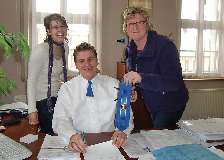 Schnell war man fündig geworden. Wo? Natürlich beim Chef selbst. Es kann doch wohl nicht angehen das Bürgermeister Matthias Strejc an so einem Tag mit Schlips regiert, dachten sich die beide Politessen bei der Kontrolle. Und Schwups wurde Hand angelegt an das gute Stück des Bürgermeisters.