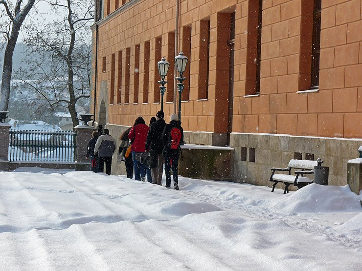 Autor: khhAber zum Schluss fand natürlich alles sein glückliches Ende. Zum Glück gibt es ja auch noch im Schloss die Kreismusikschule, die am Wochenende mit Räumlichkeiten aushelfen konnte. Im Bild sieht man, wie man bei Schneefall am Samstag sich zu den Räumlichkeiten auf machte.