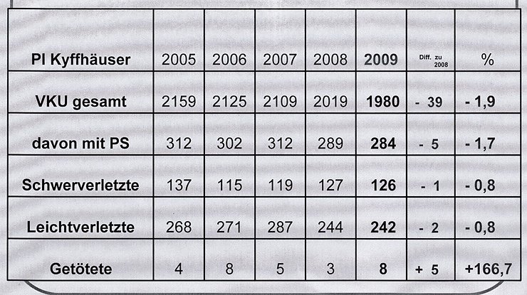 Heute stellte die Polizeiinspektion Kyffhäuser die Verkehrsunfallstatistik 2009 für den Kyffhäuserkreis vor. Was im Vorbericht vielleicht noch zum Schmunzeln war, zeigte sonst leider eine teilweise recht traurige Statistik. Hier kn mit den Einzelheiten...