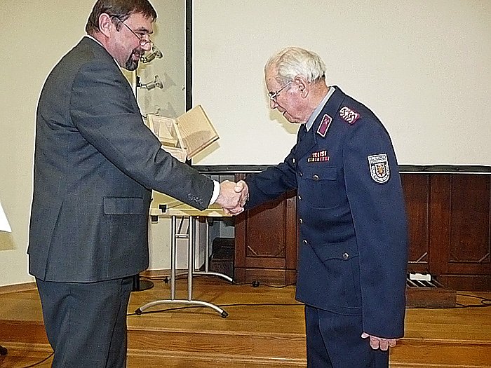 Auf Vorschlag der Stadtteil Feuerwehr "Paul Volkmann " Sondershausen-Jecha und des Jechaer Feuerwehrverein e.V. wurde Kamerad Hauptbrandinspektor Erwin Heublein mit der Ehrengabe der Stadt Sondershausen ausgezeichnet, die Bürgermeister Joachim Kreyer übergab. Wollte man die ganze Begründung schreiben, hätte man viel zu tun. Deshalb sollten es einige wenige sein, ohne damit eine Wertung vorzunehmen.