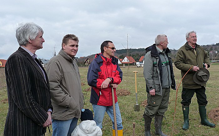 Bernd Becker, Geschäftsführender Vorstand der Schutzgemeinschaft "Deutscher Wald" und Forstamtsleiter Oldisleben, Uli Klüßendorf, begrüßen die Ehrengäste der Baumpflanzung, so Vizelandrat Georg Schäfer, Bürgermeister Matthias Strejc (SPD). der sich tatkräftige Unterstützung mit gebracht hatte, sowie Bundestagsmitglied Johannes Selle (CDU).