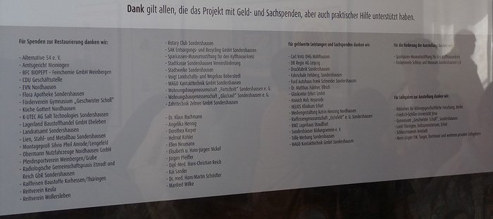 Natürlich galt der Dank von Mario Wilke auch den vielen Förderern bei der Restaurierung. Alle Namen hier zu nennen ist überhaupt nicht möglich, wie man oben an den Bildausschnitt der genannte Förderer ersehen kann. Aber auch hier, so Mario Wilke konnten nicht alle Spender aufgeführt werden. Mario Wilke machte aber keinen Hehl daraus, dass trotz der zahlreichen Spenden noch runfd 3.000 Euro fehlen. Das war, wie man so schön sagt, nochmals der berühmte Wink mit dem Zaunpfahl.