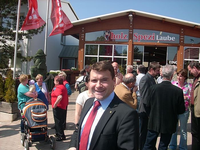 Froh ist man auch bei der holzSpezi Laube. Die Firma direkt an der Straße hatte doch lange unter der Bautätigkeit zu leiden. Pech dabei, dass durch die anhaltende Kälteperiode der Abschluss der Arbeiten lange verzögert wurde. Im Bild im Vordergrund Bundestagsabgeordneter Patrick Kurth (FDP) der nach Großfurra kam. In Verterteung von Bundestagsabgeordneter Steffen-Claudio Lemme (SPD) kam sein Assistent Steffen Lupprian. Neben Stadtratsversitzenden Dr. Christine Kietzer (CDU) war auch Ortsbürgermeister Winfried Schmidt (Die Linke) anwesend.