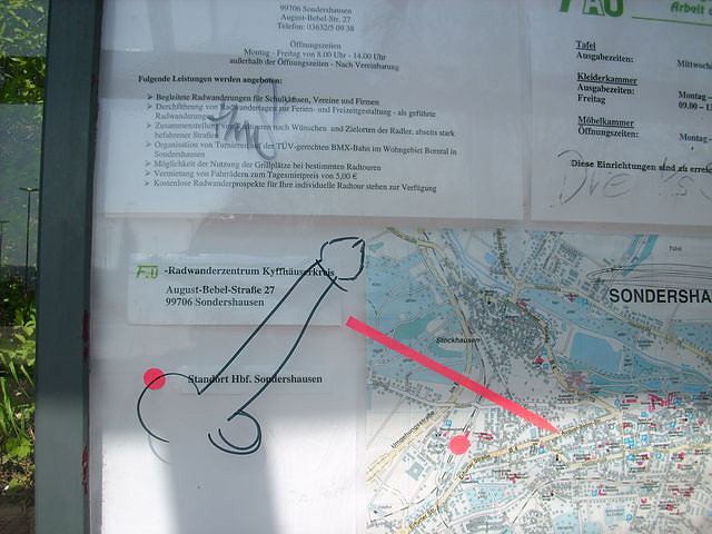 Ups, da hat man in Sondershausen aber gleich kräftig in die Tastatur der Werbtrickkiste gegriffen. Stimmt, mit Sex wirbt es sich am besten. Eine interessante Art, die Leute zum Radwanderzentrum in die August-Bebel-Straße zu locken.
