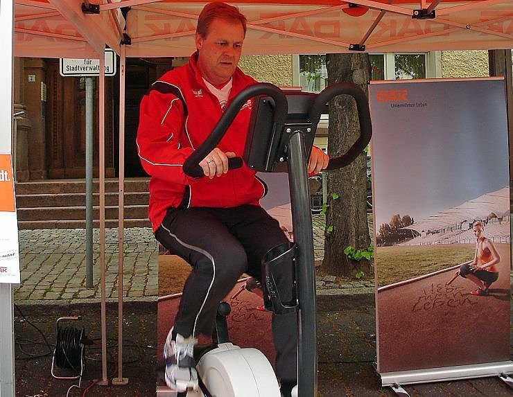 Der DAK-Städtewettkampf macht am 12. Mai 2010 Station in Artern. Ab 10.00 Uhr fiel am Marktplatz in Artern der Startschuss. 60 Bürger treten für ihre Stadt in die Pedale, angeführt von Bürgermeister Wolfgang Koenen (bild). Er legte mit 1,80 km erst mal vor.