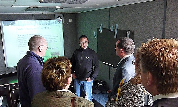 Zuvor hatte sich der Minister im Eventmobil von Frederic Seeger und dem Geschäftsführer des Vereins, Michael Göpfert, über "Highway to heaven" informieren lassen. Es geht bei der Aktion um die Frage was ist der Wert des Menschen. Wie können Jugendliche stark gemacht werden, das Gewalt, Aggressivität und Mobbing nicht das Leben zerstören. Auch wenn Michael Göpfert im Gespräch mit dem Minister sagte, "Gewalt und Mobbing kann man nicht in einer Woche heilen", so ist es doch ein wichtiger Schritt die Jugendlichen überhaupt erst mal zu erreichen. Für die Jugendlichen ist wichtig zu wissen, wo sind meine Wurzeln, Göpfert.