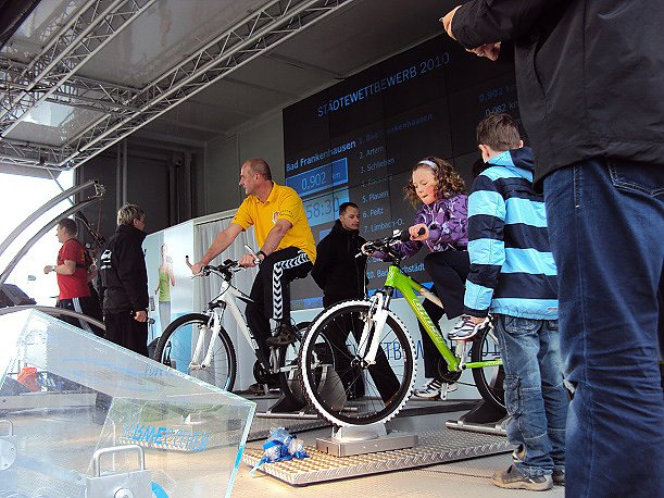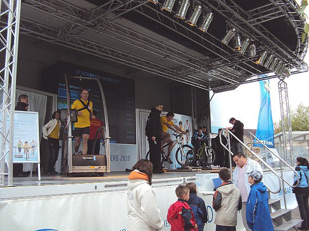 Autor: khhUm genau 12.00 Uhr am 15. Mai startete im Rahmen des Fliederfestes 2010 der enviaM-Städtewettbewerb in Bad Frankenhausen. Insgesamt 30 Kommunen werden in nächster Zeit gegeneinander antreten- und Bad Frankenhausen durfte für die restlichen 29 Städte und Gemeinden die Kilometer vorlegen. Beim enviaM-Städtewettbewerb gilt es, auf drei Sportgeräten innerhalb von sechs Stunden so viele Kilometer wie möglich zurückzulegen. Die Siegerstadt wird am Ende des Wettbewerbs 15.000 Euro, die Zweitplatzierte 12.000 Euro und die Drittplatzierte 10.000 Euro für ein gemeinnütziges Projekt erhalten. Welches das sein wird, bestimmten die Bürger vor Ort per Stimmzettel. Verlierer wird es aber so nicht geben, denn selbst die Plätze 11 bis 30 erhalten für jeden errungenen Kilometer immerhin 3,00 Euro.