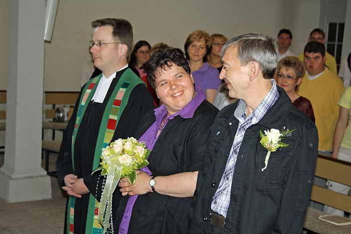Mit Orgelklängen führte Pfarrer Peter Stockmann das Paar in die Kirche. Mit der Gemeinde feierten Annika und Jürgen einen fröhlichen Gottesdienst mit Liedern und Gebeten. Peter Stockmann erinnerte, wie sich beide kennen- und schließlich lieben lernten. Annika Kehr stammt aus Straußfurt. Nach dem Tod ihrer Mutter kam die heute 29-Jährige ins Kinderheim Rastenberg. Später arbeitete sie in der einstigen Finneck-Werkstatt Hauteroda. Hier lernte sie Jürgen kennen, der damals in der Markus-Gemeinschaft lebte. Der heute 53-Jährige kommt aus dem Siegerland. Annika zog in der Folge ins Haus "Mara" und wechselte in die Finneck-Zweigwerkstatt Artern. Jürgen folgte ihr eine Woche später.