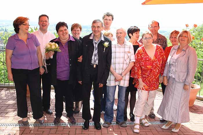 Vor der kleinen Feier im Hotelrestaurant "Weinberg" hieß es jedoch für beide, die erste gemeinsame Aufgabe als vor Gott gesegnetes Paar beim Durchsägen eines Baumstammes zu meistern. Bei herrlichem Sommerwetter konnten Annika und Jürgen schließlich mit ihren Gästen auf der Hotelterrasse die festliche Kaffeetafel und tolle Aussicht genießen und die eigens für diesen feierlichen Anlass gefertigte Torte anschneiden.