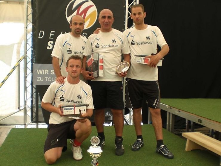 Vorher konnte das Team der Scooer4u Fussballschule aus Nordhausen die Thüringer Meisterschaften in Heiligenstadt klar für sich entscheiden. In Pößneck traten nun die drei Ausbilder Sasa Dadunashvili (langjähriger Aktivposten beim Regionalligisten FSV Wacker 90 Nordhausen), Khvicha Shubitidze (Ex-Profi unter anderem beim FC St. Pauli, Erzgebirge Aue u.a.), Omar el Zein (ein junger Spieler auf dem Sprung ins Profilager) und Marco Eck (von der Jugend Berufsförderung Erfurt). Unterstützt wurde das Team vom Hauptsponsor der Fußballschule, der Pro1media und von der Bäckerei Ludwigs.