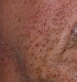 Dieser Herr hier, der gestern nachmittag das Sprühfahrzeug passierte, hatte zwar bemerkt, als ob ihm irgendwas ins Gesicht gespritzt hätte. Aber wer hat als Mann schon einen Spiegel einstecken. Das rächte sich. Hätte er gleich in den Spiegel gesehen, hätte er das Resultat dem Fahrer des Spritzfahrzeuges frisch präsentieren können. Denn die dunklen Spritzer auf der Haut sind weder Sommersprossen noch Leberflecken oder gar unreine Haut, sondern schlicht und einfach Teerspritzer. Die Gesamtansicht des schön beklecksten Gesichts wollen wir Ihnen und dem Herrn lieber ersparen.