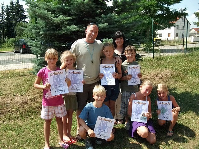 Autor: khhDie erste Woche verlief vom 12. Bis 16.07. Dabei konnten sieben Kinder im Alter von 7 bis 10 ihre Schwimmleistungen verbessern oder das Schwimmen erlernen. Das tägliche Training begann schon 9 Uhr im Oldisleber Schwimmbad. Da es der Wettergott gut mit uns meinte konnten die Kinder in der Früh gleich ins Wasser. Die ersten Tage standen unter dem Motto: Üben, Üben, Üben. Zwei Kinder trainierten auf das "Seepferdchen". Sie konnten ihre Angst überwinden und letztendlich mit nur einem Schwimmflügel im tiefen Wasser ohne Hilfe schwimmen. Bis sie ihre Technik verfeinern bedarf es noch einiger Übungsstunden, aber selbst dann bestehen sie die "Seepferdchenprüfung" mit Bravour.