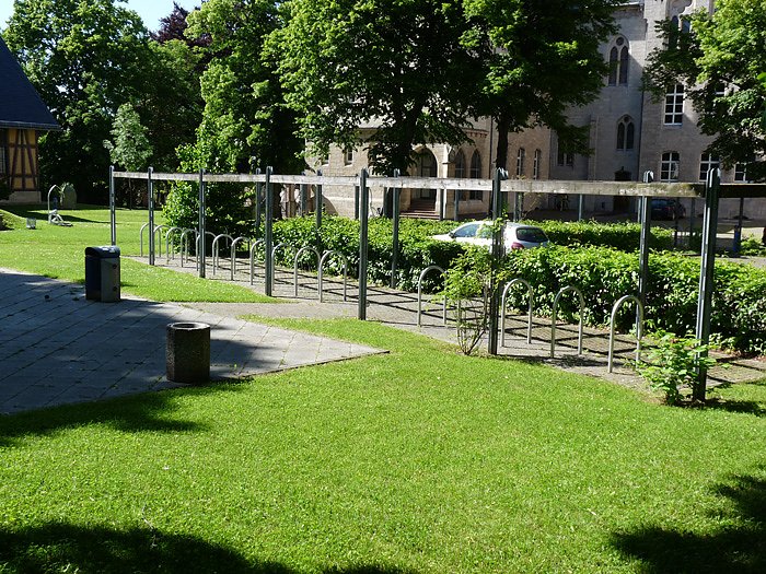 Dieser nicht viel bessere Fahrradständer steht zur Zierde im Schlosshof von Sondershausen. Auch hier lassen sich höchsten einige alte Billigräder aus dem Baumarkt abstellen. Zum Museumstag beobachtete kn selbst, wie eine Gruppe von acht Radfahren kam, den Fahrradständer sahen, kurz davor standen und dann den Schlosshof wieder unverrichteterer Dinge verließen. Die teurer Fahrräder hätte ich hier auch nicht angeschlossen.