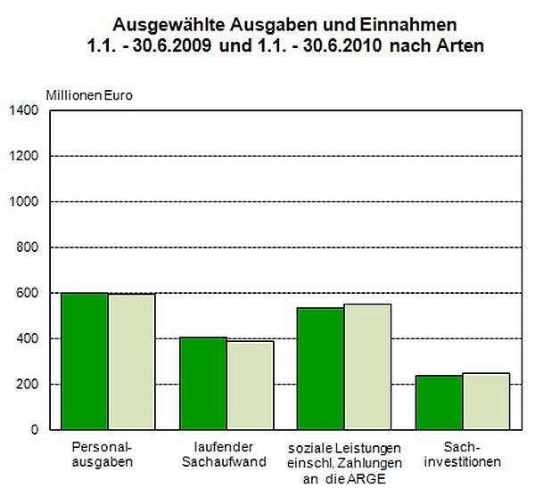 Gesunken sind auch die Ausgaben für den laufenden Sachaufwand. Insgesamt wurden 388,9 Millionen Euro und damit 14,9 Millionen Euro weniger ausgegeben als im ersten Halbjahr 2009.