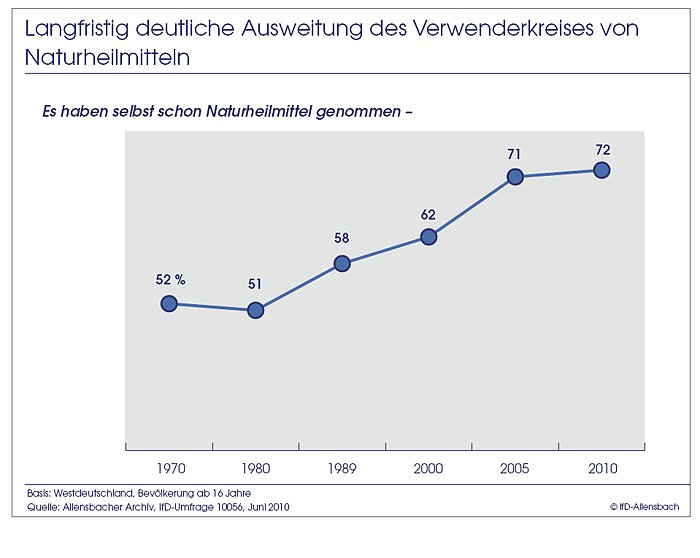 So haben 70 Prozent der Bevölkerung ab 16 Jahre bereits selbst Naturheilmittel verwendet, für weitere 19 Prozent käme dies generell oder fallweise in Frage. Lediglich 7 Prozent äußern sich strikt ablehnend. Langfristig ist der Nutzerkreis von Naturheilmitteln stark gewachsen: 1980 verwendete nur rund die Hälfte der westdeutschen Bevölkerung solche Präparate, heute sind es 72 Prozent (Schaubild 1).