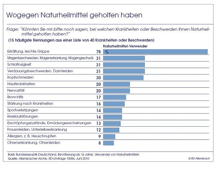 Vor allem gegen Erkältungskrankheiten werden Naturheilmittel nach Auskunft der Nutzer erfolgreich eingesetzt. 78 Prozent der Verwender berichten davon, dass Naturheilmittel ihnen in diesem Fall geholfen hätten. Aber auch gegen Magen- oder Verdauungsbeschwerden, Schlaflosigkeit oder Kopfschmerzen haben diese Präparate fast jedem dritten Nutzer bereits genutzt (Schaubild 2).