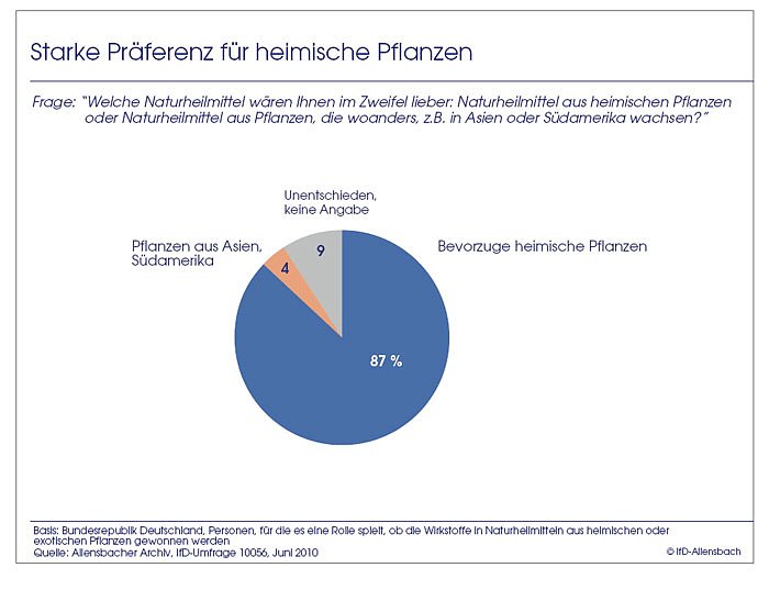 werden, spielt für jeden vierten Nutzer eine Rolle. Von denjenigen, die hier einen Unterschied sehen, bevorzugt die überwältigende Mehrheit Präparate aus heimischen Pflanzen (87 Prozent) und nur ganz Wenige Wirkstoffe aus exotischen Gewächsen z.B. Asien oder Südamerika (4 Prozent, Schaubild 3).