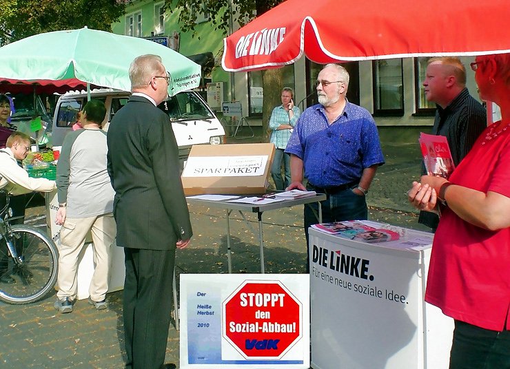 Die Linke schickte das Sparpaket symbolisch an den Absender zurück. Neben ihr waren der Sozialverband VdK sowie die Arbeitsloseninitiative vertreten, welche ihrerseits verkündeten, dass sie alles tun werden, um eine solche unsoziale Politik zu verhindern. Bürgermeister Wolfgang Koenen (Die Linke) besuchte ebenfalls die Stände.