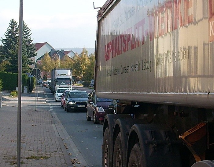 Als heute im Hasenholzwg die Schwarzdecke aufgebracht wurde, musste man natürlich auch an die Kreuzung Frankenhäuserstraße ran. Aus Platzgründen hatte man auch die Fahrbahn halbseitig eingeengt. So weit sicher auch kein Problem.