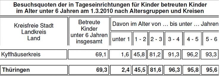 82 102 Kinder wurden am 1.3.2010 in Kindertageseinrichtungen Thüringens betreut. Die Besuchsquote der unter 6-Jährigen stieg auf 69,3 Prozent so das Landesamt für Statistik Im Vergleich dazu der Kyffhäuserkreis...