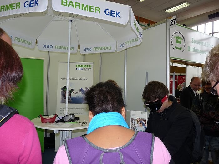 Da hat der Mann im Hintergrund, der das Ganze mit seinem Mitarbeiterteam seit Jahren hervorragend organisiert hat, wieder eine gute Mischung an Produktionsbetrieben, Handwerkern und Dienstleistungseinrichtungen zusammen getragen. Seit Jahren erfolgreich präsentieren sich auch Stammgäste der Messe wie regionale Bildungseinrichtungen, Krankenkassen, die Bundeswehr, Bundespolizeiakademie, Ausbildungszentren und die IHK, die den Jugendlichen mit kompetenten Ansprechpartnern für Fragen zu Bewerbung und Berufsaussichten gern zur Verfügung stehen.So hatte die Barmer Krankenkasse an ihrem Stand eine Brille mit, die dem Träger simuliert, wie es ist, wenn man betrunken ist, Da sind doch einige Probierer ganz schön ins Straucheln gekommen. An vielen Informationsständen wurden die Jugendlichen und Erwachsenen aktiv einbezogen. Da konnte man auch mal mit der Laubsäge arbeiten.