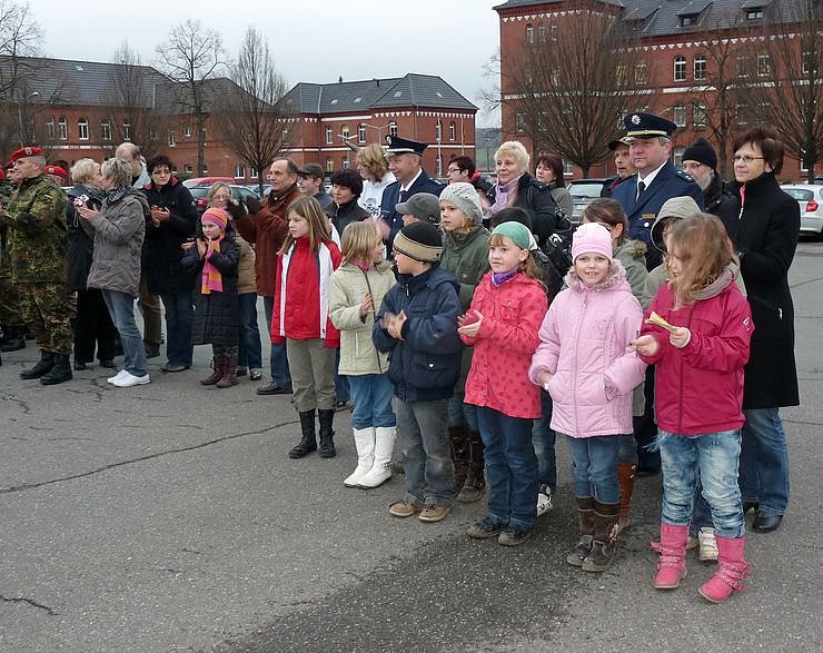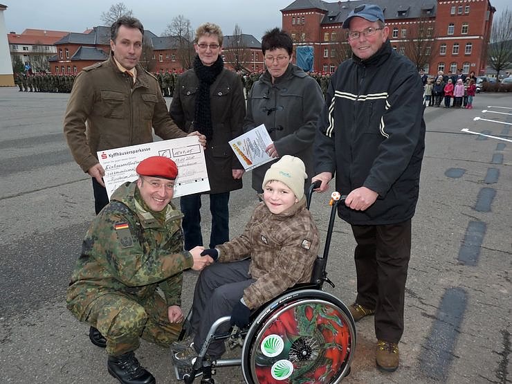 Die Familie Busch mit Enkelsohn Antonio freuten sich, als mit Handschlag von Oberstleutnant Klaus Glaab die Spendensumme von Marko Wuttke (Autohaus Peter GmbH) überreicht wurde. Bei der Übergabe des Spendenschecks dabei die Vertreterin des Kuratoriums