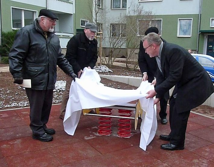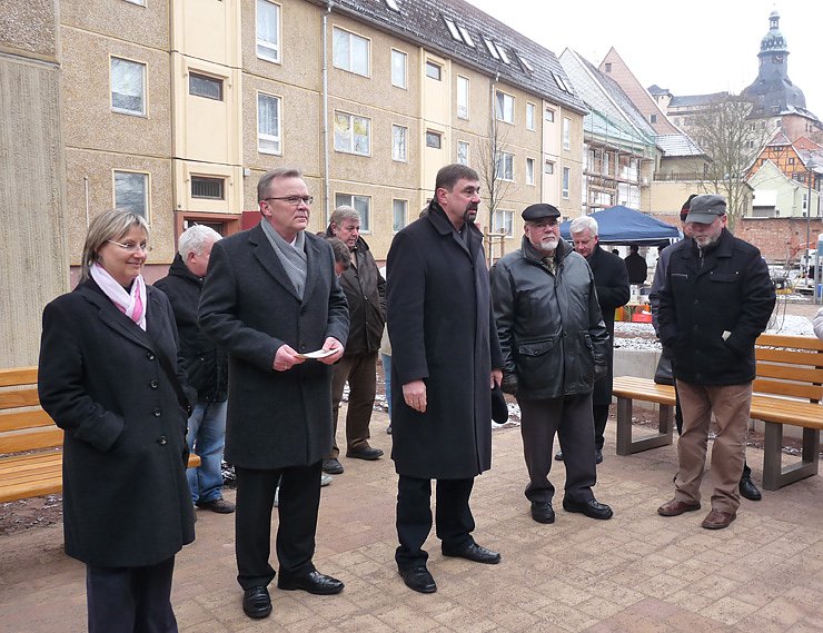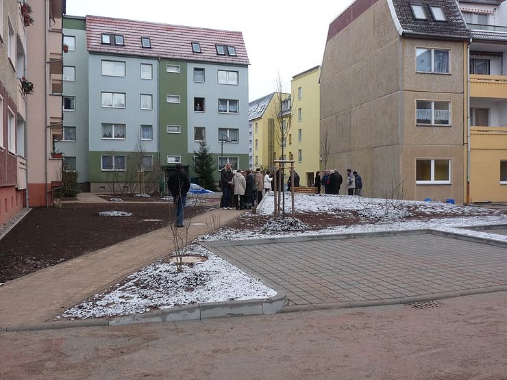 Bei der Einweihung des neu gestalteten Innenhofes des Wohngebietes Am Schlosspark in vorderster Reihe Iris Heinemann vom Landesverwaltungsamt (dem Fördermittelgeber), Eckhard Wehmeier Geschäftsführer "Wippertal" WBG mbH, Joachim Kreyer (CDU), Bürgermeister, sowie die beiden Geschäftsführer der Wohnungsgesellschaften WBG Fortschritt und die WG "Glückauf", Horst Mähler und Wolfgang Menzel