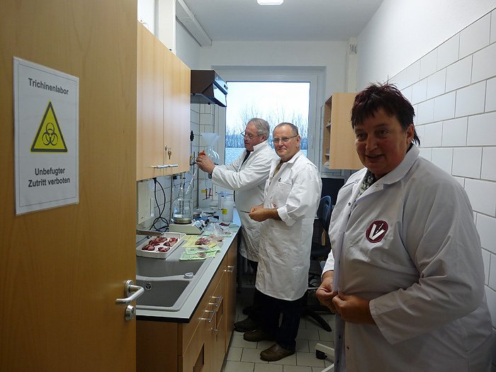 Dipl. Veterinärmedizinerin, Sabine Mund, Chefin der Lebensmittelüberwachung, präsentiert stolz ihr Trichinenuntersuchungslabor in dem die Tierärzte Herr Schmidt und Herr Micksch bereits am Arbeiten sind. In diesem Labor werden Proben von Haus- und Wildtieren, für die eine solche Untersuchung vorgeschrieben ist, bearbeitet.