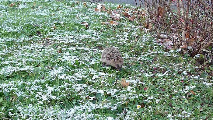 Es ist doch schon ungewöhnlich, dass dieser junge Freund in der Kälte noch unterwegs ist. Hoffentlich hat er wenigstens erst mal für die Nacht ein warmes Plätzchen gefunden, denn bei Mitternacht lag die Temperatur schon bei minus 4 °C. Nur wie sollte man helfen? Zumindest kn ist keine Igelauffangstation in der Region bekannt. Denn zu Hause, das lehrt die Erfahrungen aus den Medien, überleben die Tiere meist nicht.