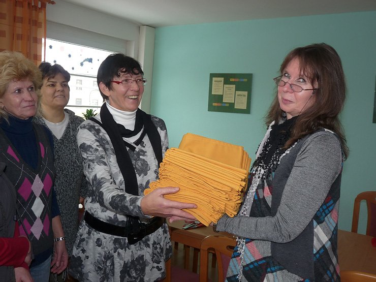 An dem Projekt sind 10 Frauen beteiligt. Und heute war ein besonderer Tag, den heute erfolgte die Übergabe von Tischdecken an die Projektgruppe Gesundheitsförderung im Stadtteil. Projektleiterin Halina Wengemuth übergibt einen Teil der Tischdecken an die dortige Projektleiterin, Burgunde Krumm (Foto oben).