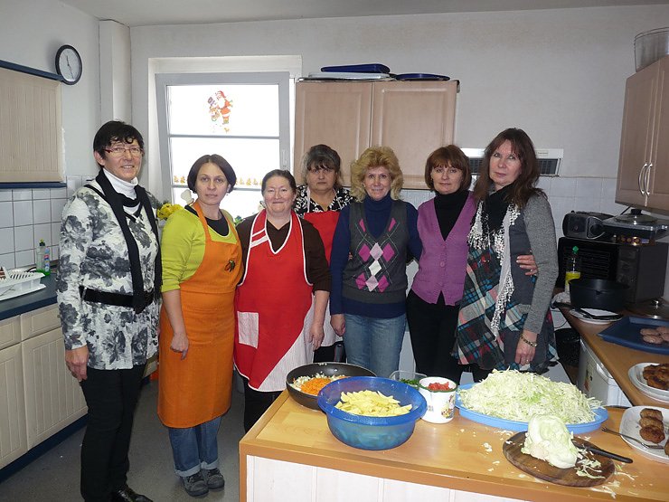Die Migranten sind bei ihren Aktionen nicht nur unter sich. Wichtig ist, so Projektleiterin, Burgunde Krumm, dass die Migranten stärker mit der deutschen Sprache konfrontiert werden, denn bei der Integration ist gerade das Beherrschen der deutschen Sprache ein wichter Bestandteil. Mit der Kamera hat sich kn mal während des Kochens in der Küche umgeschaut. Was heute gekocht wurde? Großer Schreck, zu Hause hat kn festgestellt, dass garnicht danach gefragt worden war. Aber es fiel zum Glück auch das Wort Bortsch, so das Kochexperten schon wissen, um was es ging.