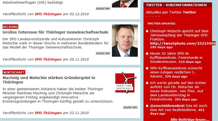 Der Trend bei der SPD hing im Vorjahr offensichtlich nur mit dem Superwahljahr zusammen? Oder wie kann es sein, dass da einiges gar eingeschlafen ist? Sowohl bei der SPD Thüringen und auch bei der SPD Kyffhäuserkreis ist wohl das "Zwitschern" per Kurznachrichten verlernt worden. Denn auf SPD-Webseite fand kn heute, den 05.12.2010 folgende Meldungen zum Thema Twitter.