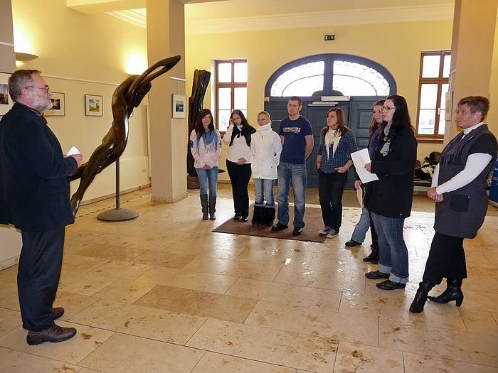 Saskia Müller und Kathrin Siegmann erläuterten den Gästen die Ziele der Ausstellung und bedanken sich beim Landrat, dass er Möglichkeit der Ausstellung ermöglichte. Unterstützt wurden die Jugendlichen durch Dipl. Designerin Marika Ratzka aus Dessau.