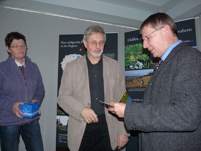 Die heute akkreditierten Botschaften waren alle in der Landschaftspflege aktiv. Die Übergabe der Pässe nahmen Carmen Rosentock und Jörg Nonnen vor. Zu den weiteren Botschaftern gehörten der Schäfermeister Dietmar Conrad, Roland Götze, Inhaber einer Landschaftspflegefirma, Marion Tettenborn von der Gemeinnützigen Förderungsgesellschaft Arbeit und Umwelt mbH sowie Caria Jans und Wolfgang Kablau, beide Arbeitnehmer des 2. Arbeitsmarktes, sehr sich intensiv mit der Landschaftspflege identifizierten. "Wir zeichnen damit Menschen aus, die weit über ihr berufliches Engagement für den Naturpark Kyffhäuser arbeiten und dafür Ihre Zeit, Ihr Wissen und Ihre Erfahrung geben", erläuterte Jörg NonnenLeiter der Naturparkverwaltung. Von Jörg Nonnen erhielten sie auch ihren Botschafter-Pass, der sie als Botschafter des Naturparks kennzeichnet. Wolfgang Kablau konnte heute den Termin nicht wahrnehmen.
