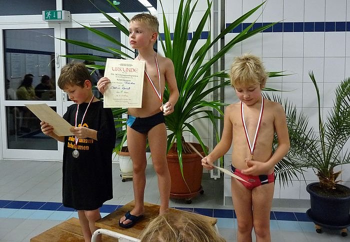 Natürlich gab es neben Medaillen auch Urkunden, wie hier bei Laura Henhof, Lisa Eichhorn und Selina Kalka zu sehen, die beim Rückenschwimmen erfolgreich waren.