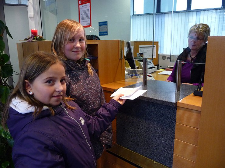 Da Emily auch Klassensprecherin der 6b ist, nutzte sie die Möglichkeit ihre Idee in der Klassensprecherversammlung vorzutragen. Alle Klassensprecher stimmten der Spendenaktion zu und trugen die Information in ihre Klassen. Gesagt - Getan! Daraufhin kamen insgesamt 128 Euro zusammen, die bei der Kyffhäusersparkasse eingezahlt werden konnten.