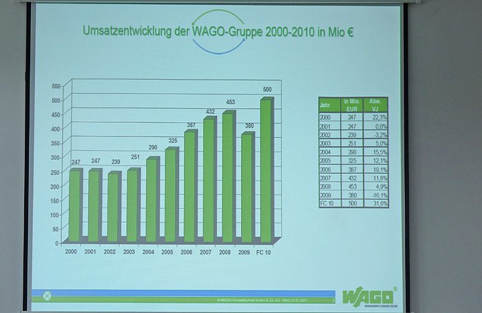 Mit einem Umsatz von über 500 Mio. € hat Wago in 2010 ein neues "All-time-high" erreicht. Ein Ziel, das zwar angepeilt aber zu Beginn des Jahres nicht wirklich erwartet wurde. An diesem Erfolg haben alle Mitarbeiter durch ihren unermüdlichen Einsatz maßgeblichen Anteil. Die halbe Milliarde bedeutet ein Plus von 30 % zum Vorjahr. Damit wurde auch der Umsatz 2008 mit 10 % übertroffen.