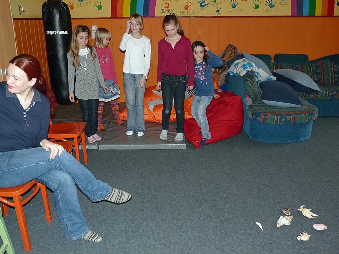 Beim Theaterworkshop standen heute am Nachmittag szenische Übungen auf dem Programm. Dabei musste sich jeder um seine Muschel kümmern. Anleitung dazu kam von Frau Henne vom Jugendtheater Nordhausen.