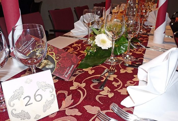 Sowohl im Marstall, wie hier im Bild, als auch im Achteckhaus hatte man liebevoll die Tische eingedeckt. Damit die Gäste im Marstall auch das Geschehen bei der Eröffnung im Achteckhaus verfolgen konnten, hatte man dort Videoleinwände aufgestellt.