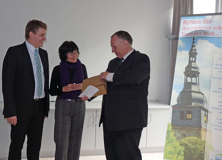 Bürgermeister Matthias Strejc (SPD) und die Vereinsvorsitzende des Fördervereins der Oberkirche Bad Frankenhausen, Bärbel Köllen, nahmen aus der Hand von Geschäftsführer Dr. Martin Schilling den ersten Karton mit den Fensterbildern entgegen. Die Fensterbilder werden in den nächsten Tagen an den verschiedenen Stellen von Bad Frankenhausen zu Preis von 10 Euro verkauft. Mit dem Kauf hat man nicht nur ein Schmuckstück für sein Fenster erworben, sondern die 10 Euro fließen vollständig in den Spendentopf zu Gunsten der Oberkirche.