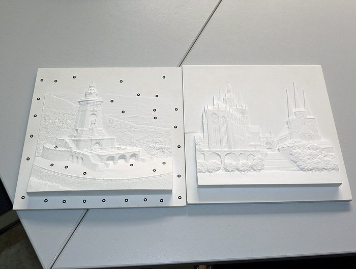 Und auch scherzhaft ging es bei der Präsentation zu. Zu den Reliefbildern von Kyffhäuserdenkmal und Erfurter Dom sagte der Geschäftsführer schmunzelnd, falls die einstürzen, dann haben wir wenigstens schon die Reliefbilder. Na dann wollen wir mal lieber nicht den schlimmsten Fall annehmen, denn der Boden in Thüringen ist ja löchriger als der berühmter Schweizer Käse, wie die Ereignisse in letzter Zeit zeigen.