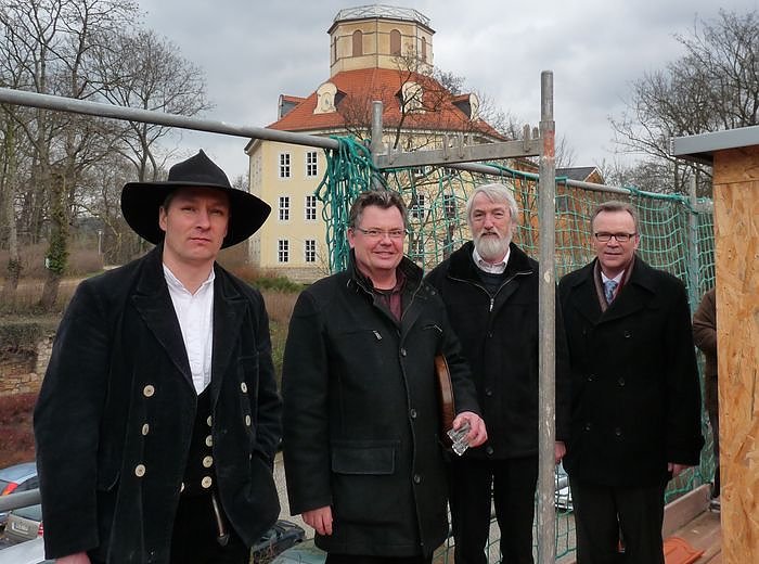 Steffen Hellmuth (von Holzbau Hellmuth) der auch den Richtspruch tätigte, Architekt Karsten Schmidt (AIG mbH), der Direktor der Landesmusikakademie Thüringen, Prof. Dr. Eckart Lange und der Bauherr der "Wippertal" WBG mbH, Geschäftsführer Eckhard Wehmeier, konnten nach dem Richtspruch zufrieden in die Kamera lächeln, liegt man doch gut im Zeitplan.