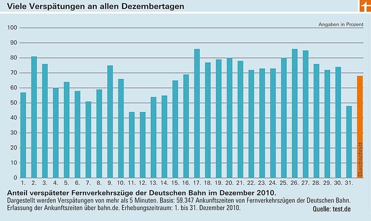Über die Pünktlichkeit ihrer Züge schweigt die Bahn. Detaillierte Statistiken hält sie streng geheim. Offenbar sogar gegenüber dem Verkehrsministerium. In dessen Winterbericht heißt es, die Pünktlichkeit im Fernverkehr sei im Dezember "tageweise unter 70 Prozent" gesunken. Die Untersuchung der Stiftung Warentest kommt zu einem anderen Ergebnis: An 20 wichtigen Bahnhöfen und Verkehrsknoten lag die Pünktlichkeitsquote der Fernzüge im Schnitt nur bei 32 Prozent. Selbst an guten Dezembertagen kamen lediglich 56 Prozent der Fernzüge pünktlich. An schlechten sogar nur 14 Prozent. Die 70 Prozent-Quote schaffte die Bahn an keinem einzigen Tag.Anschlusszug weg