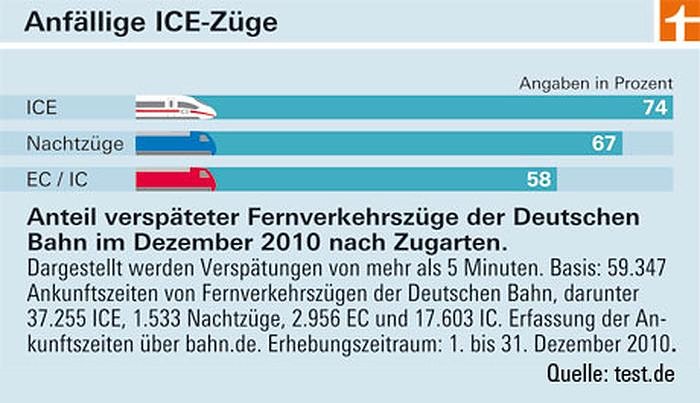 Als verspätet gelten Züge, wenn sie ihrem Fahrplan mehr als fünf Minuten hinterherfahren. Für umsteigende Reisende reichen oft schon wenige Verspätungsminuten, um den Anschlusszug zu verpassen. Frühere Untersuchungen der Stiftung Warentest zeigten, dass vor allem Regionalzüge häufig nicht auf unpünktliche Fernzüge warten. Wer deswegen zu spät ankommt, hat zusätzliches Pech: Entschädigungen zahlt die Bahn erst bei Verspätungen ab einer Stunde.Anfällige ICE-Züge