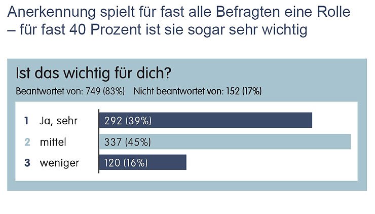 Mehr als die Hälfte (53 Prozent) der befragten Jugendlichen jedoch gaben an, nur teilweise Anerkennung für ihre Tätigkeit zu bekommen. 8 Prozent erfahren keine Anerkennung, obwohl es für eine große Mehrheit (84 Prozent) sehr wichtig ist.