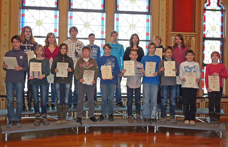 Autor: khhDas sind sie, die Matheasse des Kyffhäuserkreises, zumindest 18 davon, die am heutigen Tag teilnehmen konnten. Insgesamt 22 Schülerinnen und Schüler hatten in der 2. Runde der Mathematikolympiade die magische 15 Punkte Hürde übersprungen, die nötig war, um ausgezeichnet zu werden. Der Beste erreichte sogar 39 Punkte! Die Ausgezeichneten kamen aus allen vier Gymnasien des Kyffhäuserkreises.